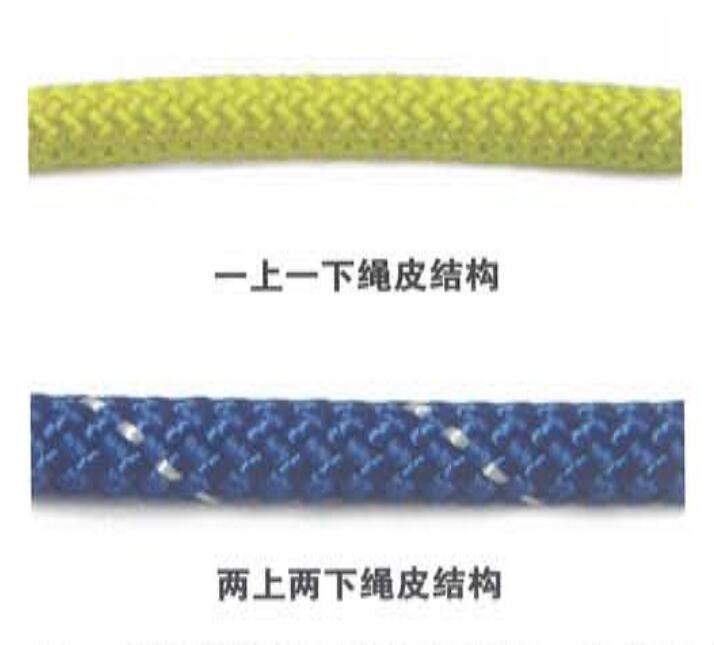 繩皮的設(shè)計會對繩索操作、繩皮滑動、耐磨性和繩索的打結(jié)有所影響。繩索制造商會根據(jù)他們的經(jīng)驗選擇繩索的股數(shù)和編織方式,以便制造出性能最佳的繩索。例如,對于繩皮是48股線的繩索來講,制造商會說其光滑的繩皮具有較好的耐磨性,而對于繩皮是16股線的繩索來講,制造商會說它粗糙的繩皮具有較大的耐磨性。